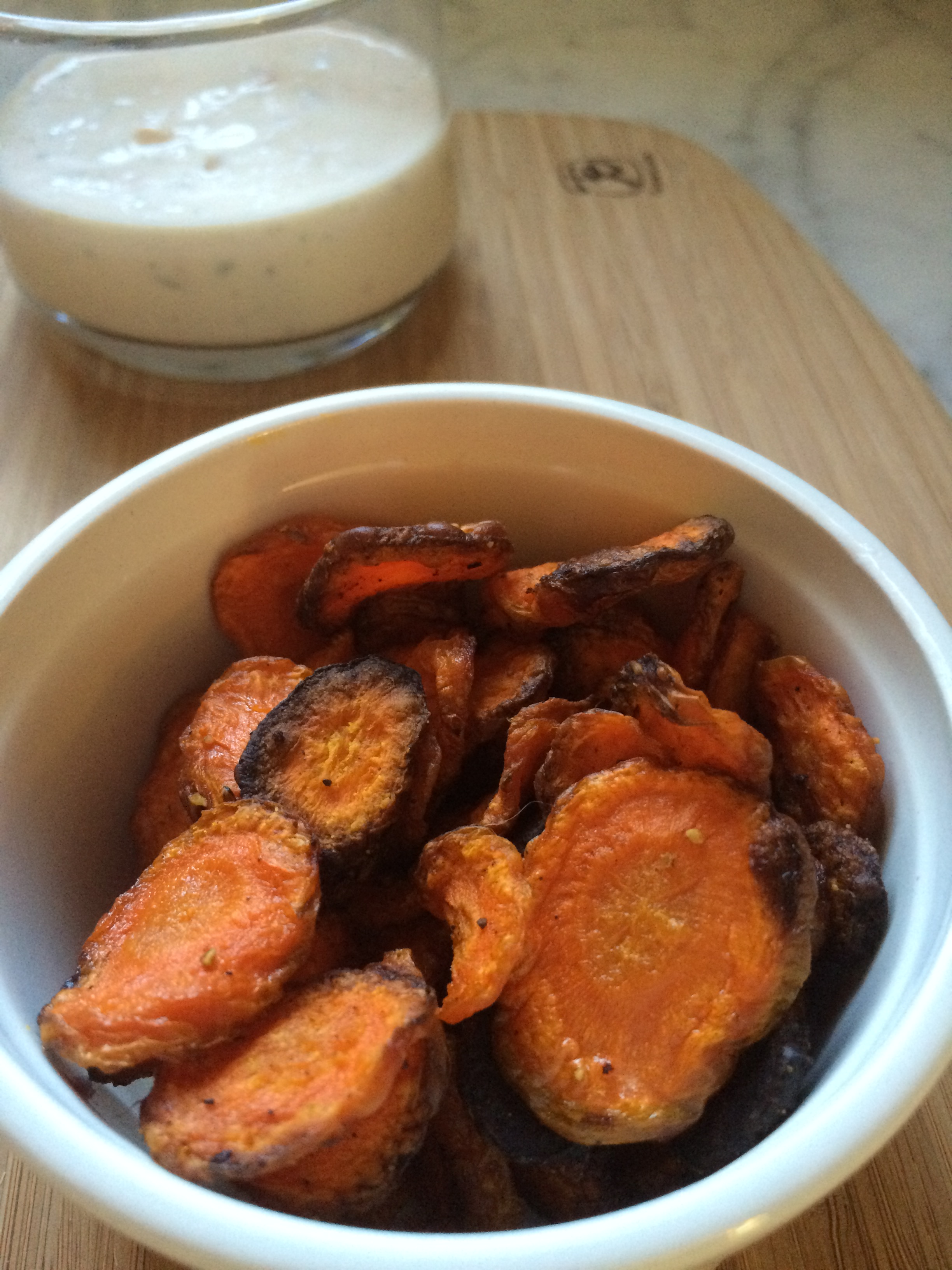 Carrot chips + healthy, rosemary, non-fat yogurt dip
