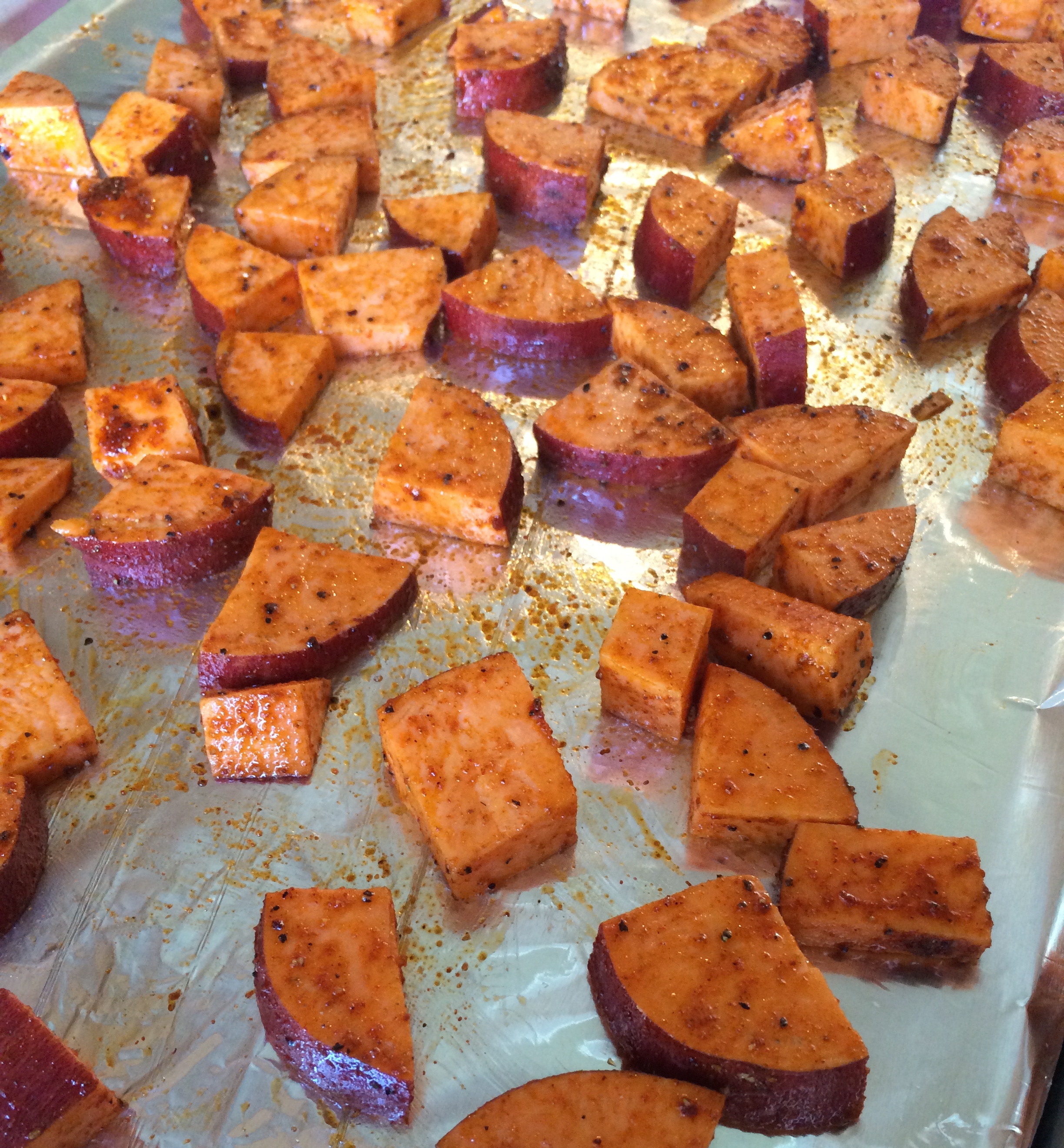 - Once the sweet potatoes are done, remove them from the oven. Lower the heat to 425.